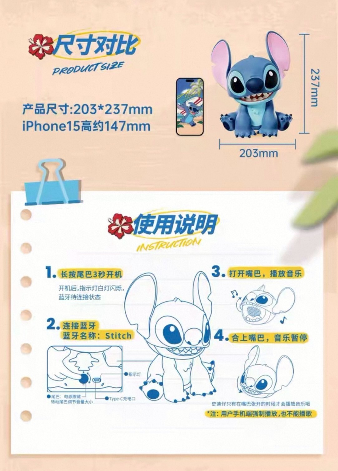3.打開嘴巴即可撥放音樂。(史迪奇只有在張嘴時才能撥放音樂唷)