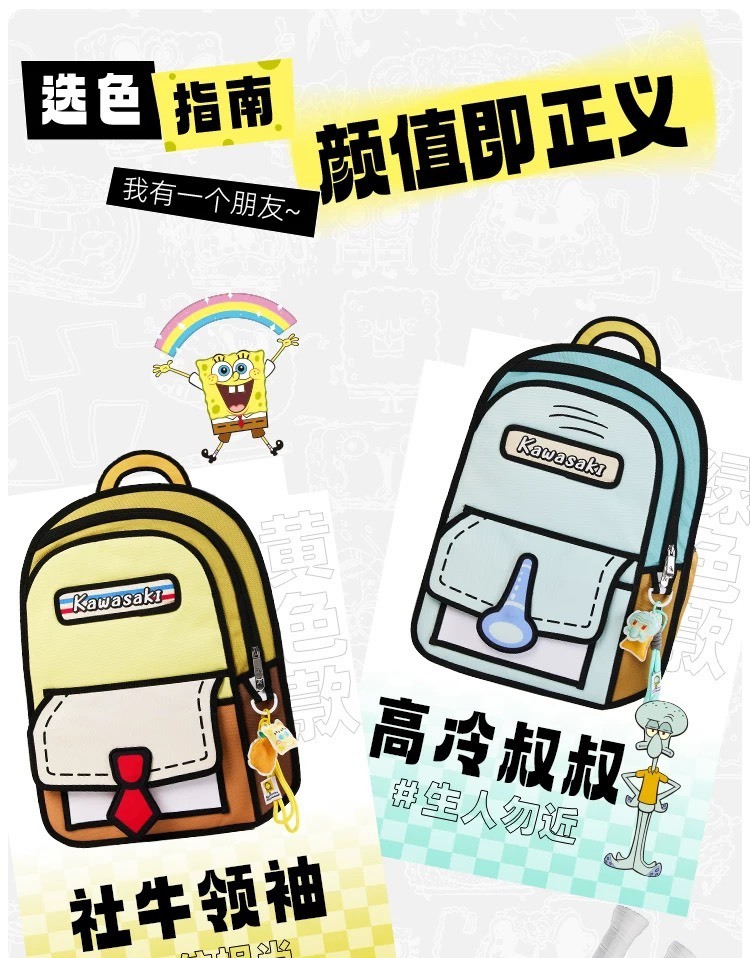 品牌:Kawasaki系列:比奇堡聯名容量:39L尺寸:78*15*33.5CM材質:聚酯纖維