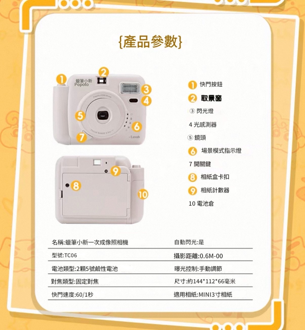 🔹內容物:小新相機、相機掛繩、電池*2、相紙*10、貼紙*1